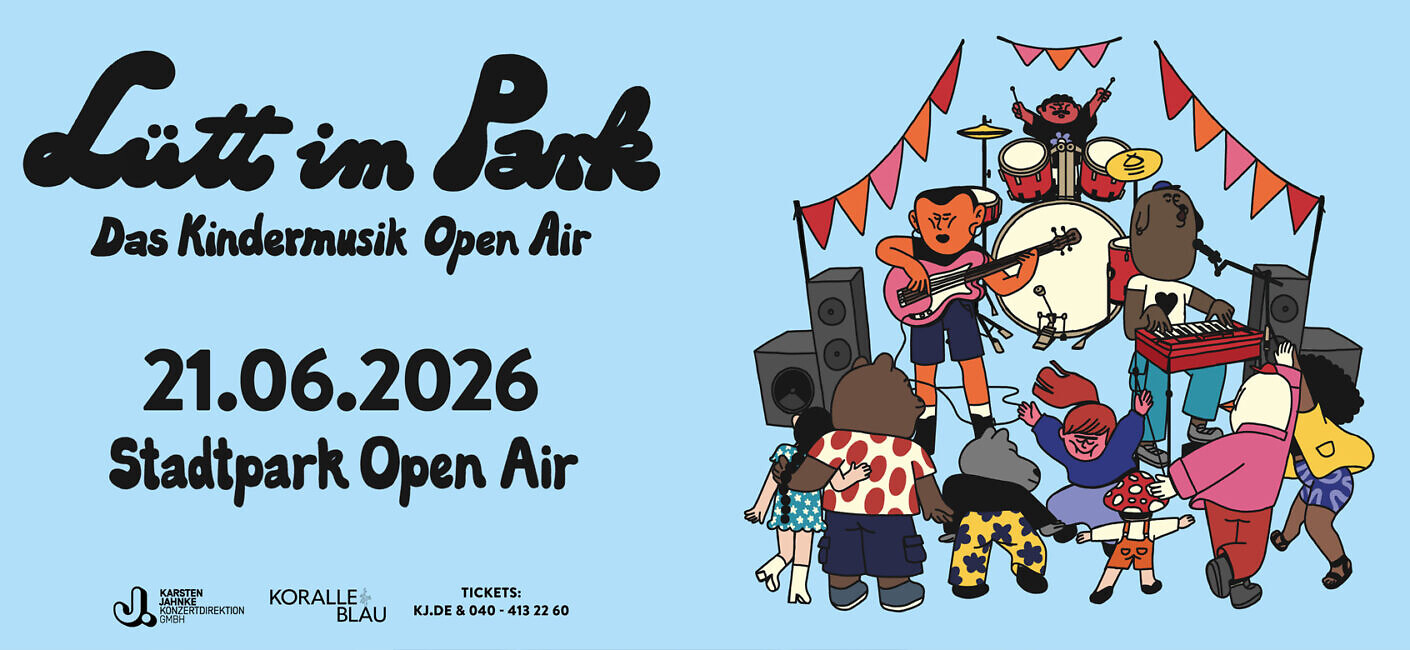 Das Kindermusik-Open Air Lütt im Park ist inzwischen ein festes Ritual innerhalb der Stadtpark Saison. Auch 2026 wird es wieder intelligente Kindermusik für Kleine & Große geben – zum Tanzen, Lachen, Nachdenken und natürlich Mitsingen. Die Veranstaltung steht im Zeichen von ›Unter meinem Bett‹, dem beliebten Musiksampler, dessen Hits seit Jahren aus den Kinderzimmern und Familien-Autoradios schallen. Beim Live-Programm auf der grünen Bühne gibt es wieder Kindermusik satt, ein buntes Rahmenprogramm rundet ›Lütt im Park‹ ab!